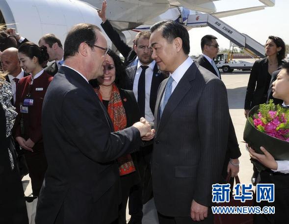 4月25日,应中国国家主席习近平邀请,法国总统弗朗索瓦·奥朗德抵达北京,开始对中国进行国事访问。这是中国外交部长王毅到机场迎接。 新华社记者 张铎 摄