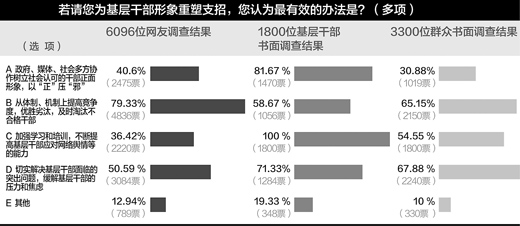 重塑基层干部形象,最有效的办法是什么?调查显示,100%的受访基层干部认为应“加强学习和培训,不断提高应对网络舆情等的能力”;而79.33%的网友则认为应“从体制、机制上提高竞争度,优胜劣汰,及时淘汰不合格干部”。采访中,不少基层干部认为“打铁还需自身硬”,只有破除“本领恐慌”,方能扭转社会对基层干部的负面印象。