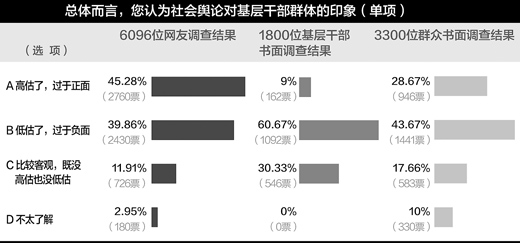 “您认为社会舆论对基层干部群体的印象如何?”60.67%的基层干部和43.67%的群众认为“低估了,过于负面”;45.28%的网友则认为“高估了,过于正面”。