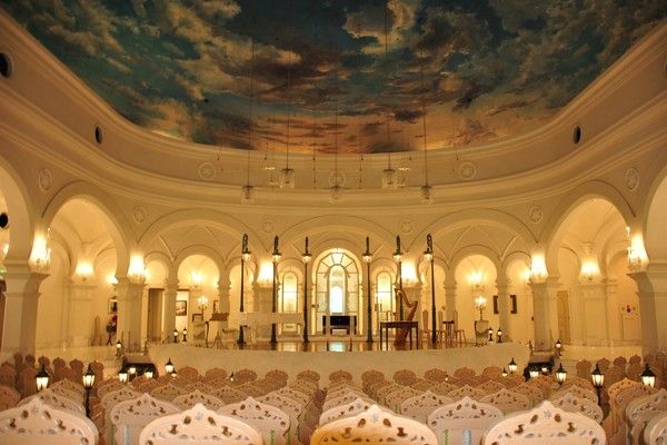 虽然这个展室面积不大,身处其中却令人如入梦幻之境音乐堂,穹顶是巨大幅油画作品,舞台、回廊、座椅全部是白色主题,到处透着纯洁浪漫的气息。