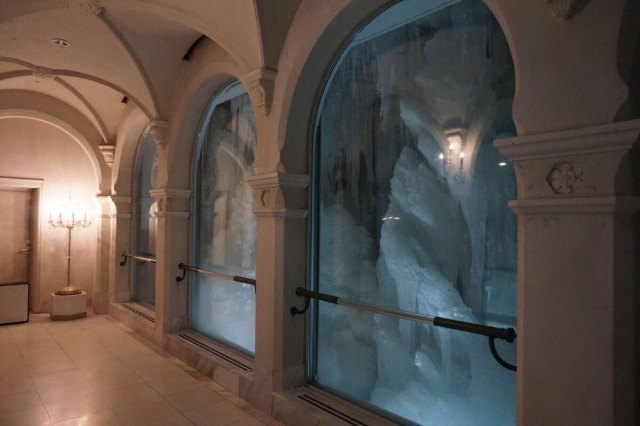 冰柱回廊被厚厚的玻璃墙隔离在里面,可以欣赏到造型各异的冰柱雪之结晶室,墙壁和穹顶共收集了200张显微镜下雪花结晶的照片