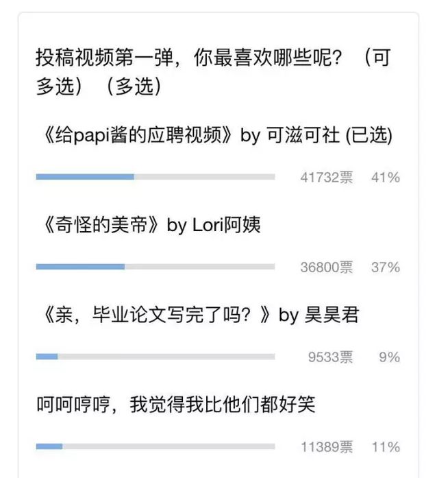 一个月过去,papitube正式推出,第一批入选的有三条视频,分别是《papi酱的应聘视频》(by可滋可社);《奇怪的美帝》(by LORI阿姨);《亲,毕业论文写完了吗》(by昊昊君)。据新榜统计,这条推送一小时就突破10万阅读,虽然相比10分钟破10万+的头条来说还差了一大截,但毫无疑问,papi酱的粉丝乐于接受新鲜血液的注入,有近10万人参与了文章底部的投票。