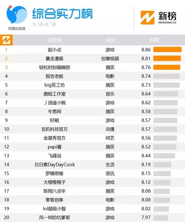 综合新榜联合优酷发布的优酷自频道影响力排行榜来看,papi酱在综合实力榜的排位从3月28日起就一直稳居前三,但近两周已经连续徘徊在10名左右,这是否让papi酱意识到打造一支属于自己的原创视频作者团队的重要性了呢?